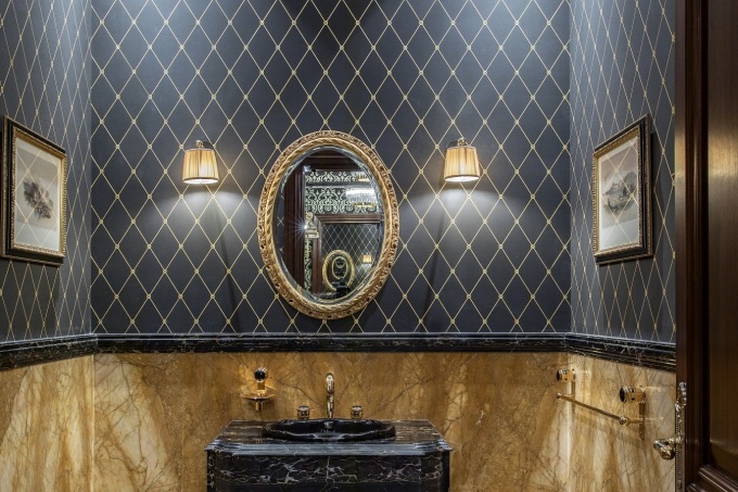 Современный дворцовый дизайн гостевого санузла способен восхитить даже особ королевских кровей. Такой интерьер отличается особой роскошью и изяществом. Он способен подчеркнуть не только отличный вкус хозяев дома, но и их высокий статус. Недаром в нем сочетаются самые богатые стилевые направления – рококо, ампир и барокко.