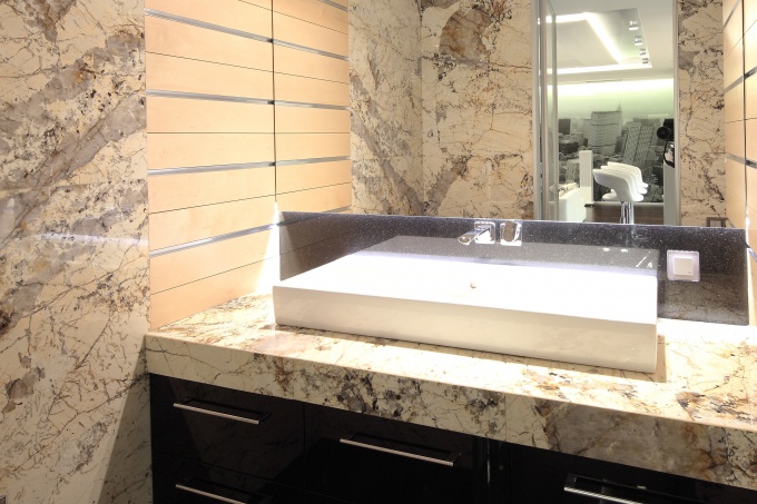 Два его фасадных материала – светлый шпон дуба и лакированная поверхность МДФ песочного цвета поддержали общую цветовую гамму и фактуры отделок основных помещений.