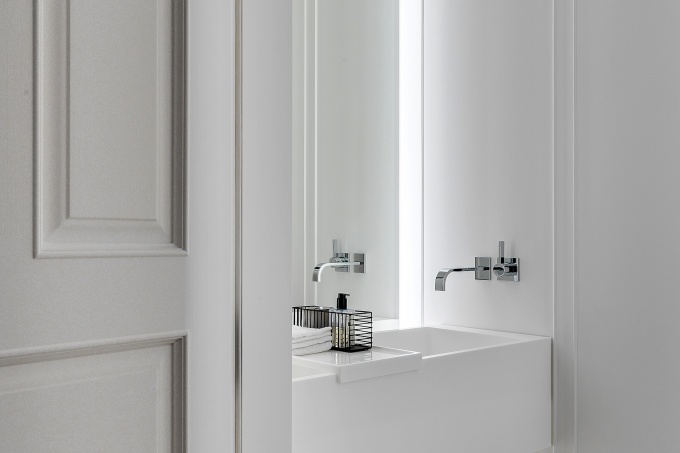«Наш клиент – большой ценитель классики, он поставил задачу спроектировать статусный интерьер, в котором удобно жить одному и принимать гостей, собираться большими компаниями. На чистой классике не настаивал, но именно она стала основой интерьера: классические пропорции, осевое построение, принципы симметрии, характерные детали стали фоном для современного дизайна, - рассказывают авторы проекта. – Образ интерьера сложился сразу, как только мы зашли на объект: роскошные панорамные окна, захватывающие городские перспективы и сталинская высотка, которая отлично просматривалась прямо от входа, легли в основу декоративного решения пространства. Нам следовала найти такие средства и решения, чтобы они стали достойным обрамлением прекрасного вида за окном».