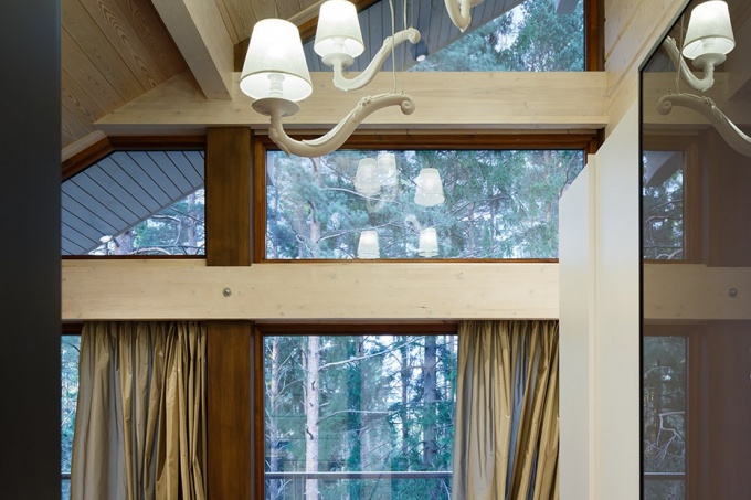Для семьи с двумя детьми архитекторы спроектировали и оформили резиденцию, в которой обыграны черты северной природы. Главный двухэтажный дом и СПА-комплекс построены из клееного бруса сосны и расположены среди исполинских деревьев. Участок размещен на склоне, поэтому сквозь силуэты сосен просматриваются потрясающие природные перспективы. Перед архитекторами была проставлена задача создать комфортное загородное жилье, в котором природа была бы неотъемлемой частью интерьера.