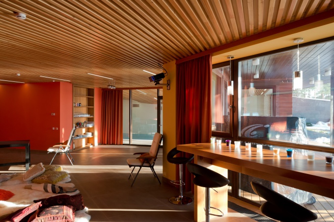 Конструктивные элементы дома выполнены из монолитного железобетона и клеёного соснового бруса. В целом, в проекте использована древесина трех пород: сосны, лиственницы и мореного дуба.