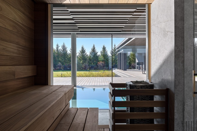 К дому пристроена просторная терраса с большим камином и обеденным столом на десять персон. На участке также спроектирован двухэтажный СПА-комплекс с бассейном и всесезонная теплица, где семья выращивает овощи и зелень, воплощая концепцию farm to table. Это настоящая современная усадьба, где интерьер, архитектура и ландшафт тесно связаны друг с другом.