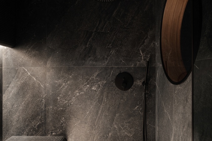Часто декораторы используют материалы с зеркальной поверхностью. Отделка из камня и глянцевый кафель позволяют визуально расширить комнату и будет красиво смотреться в любой планировке. Загадочности помещению придадут декоративные вставки правильной геометрической формы, выполненные из стекла. На фоне мраморной стены такая отделка выглядит просто изумительно.