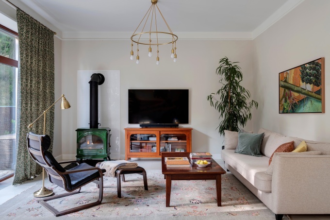 Чтобы не спорить с природой, дом решили построить одноэтажный, но с огромными окнами. Дизайнер признается, что на необычную форму оконных рам, ее вдохновил собственный дом Константина Мельникова в арбатских переулках. Но пытливый глаз найдет в интерьере оммажи и другим великим: от Фрэнка Ллойда Райта до Антонио Гауди и Уильма Моррриса.