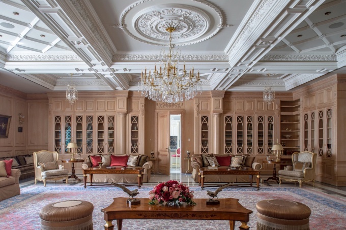 Для ценителей дворцовых интерьеров Версаля и пригородов Петербурга архитекторы бюро ABhome оформили подмосковную семейную резиденцию, придав ей черты исторических архитектурных ансамблей. Работа над столь масштабным проектом шла 4 года, значительная часть изделий из дерева, гипса, камня, стекла была сделана на заказ, в индивидуальном порядке подбирались светильники и ткани для текстильного оформления стен и окон, разрабатывались сюжеты декоративных росписей.