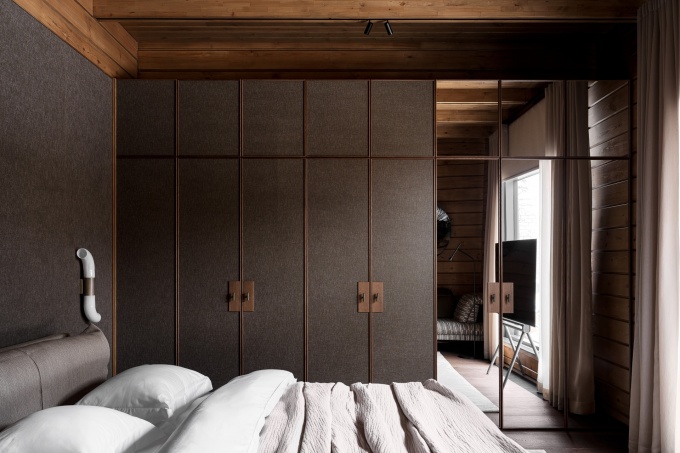 Декоративный образ интерьера отсылает к традиционному шале в современном авторском прочтении. В оформлении пространства ставка сделана на природные тактильные материалы, которые еще больше подчеркивают красоту и тепло натурального бруса.