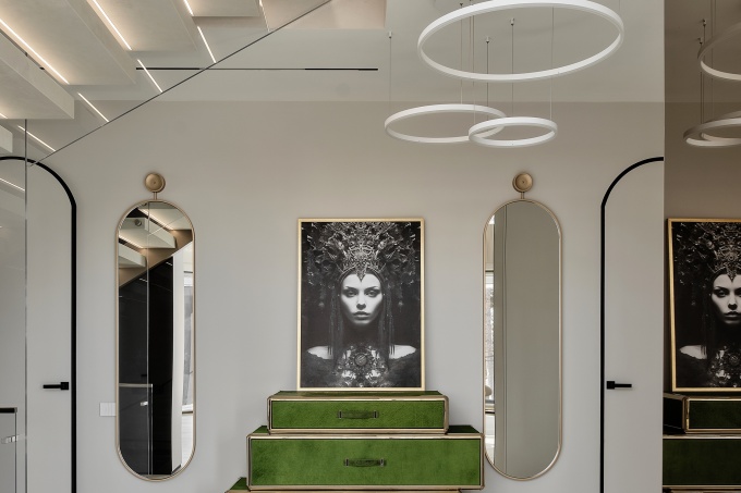 «Я не присутствовала на первой встрече, мне передали только запись разговора, - рассказывает архитектор. – В ней заказчица озвучила основные пожелания: связь интерьера с экстерьером, индивидуальная вневременная стилистка с отсылками к ар-деко, авторские, но без экстравагантности решения, нейтральная цветовая палитра с нюансной деталировкой и каменный пол в помещениях первого этажа. Сначала меня смущал камень, так как почти любой мрамор имеет активный рисунок и берет на себя много внимания. Но мне удалось найти идеальный вариант – юрский мрамор, у него абсолютно нейтральный цвет и сложная текстура с включением окаменелостей». В итоге именно камень задал основную линию: мягкие бежево-песочные оттенки и тактильные фактуры объединили весь интерьер. Благодаря такому решению все 1300 кв. м воспринимаются как единое цельное пространство, очень комфортное для проживания. Нейтральный цвет хорошо подчеркивает архитектуру и пластику стен и оттеняет цветовые акценты, раритетный винтаж и искусство.