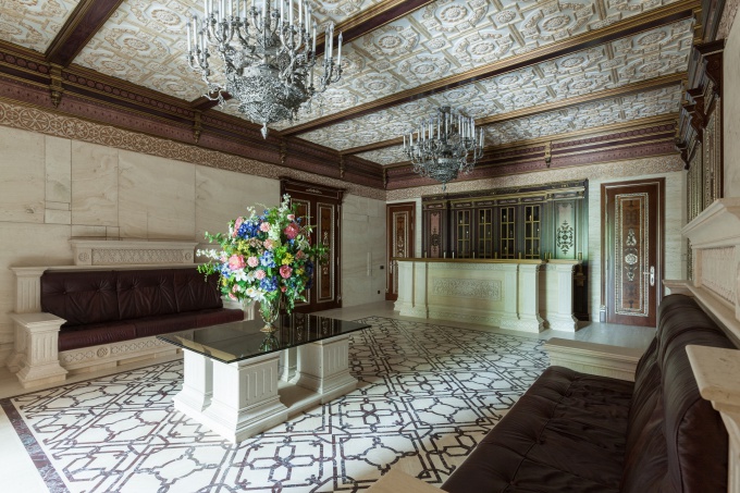 Интерьеры отведенного для отдыха и релакса здания должны были быть респектабельными, эффектными и способными удивлять. Поэтому архитектор выбрал путь эклектики, сложного сочетания разных стилей и направлений. Но ключевую роль в его многоплановом облике играют элементы романского стиля и готики.
