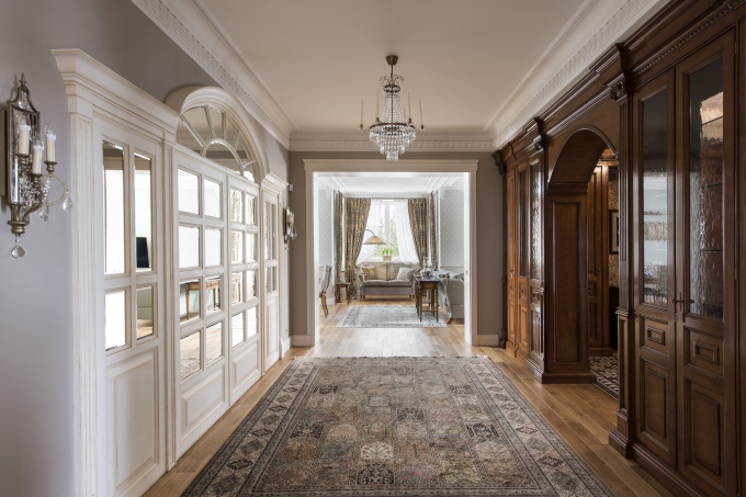 Правильно разделить это пространство на прихожую и холл, откуда расходятся все пути передвижения в интерьере. Я советую предусмотреть так же не один, а два гардеробных отсека – один сезонный и видовой, являющийся частью интерьера, другой – технический. В нем можно хранить остальную одежду.