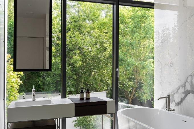 Первый этаж визуально проницаем и открыт, в отделке фасада используются стекло и сатинированная нержавеющая сталь, позволяющие растворить его в окружающем ландшафте и наполнить отраженным светом сад.
