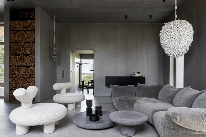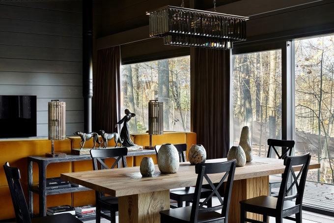 Чтобы не спорить с природой, дом решили построить одноэтажный, но с огромными окнами. Дизайнер признается, что на необычную форму оконных рам, ее вдохновил собственный дом Константина Мельникова в арбатских переулках. Но пытливый глаз найдет в интерьере оммажи и другим великим: от Фрэнка Ллойда Райта до Антонио Гауди и Уильма Моррриса.