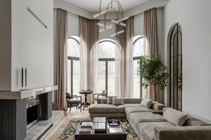 «Я не присутствовала на первой встрече, мне передали только запись разговора, - рассказывает архитектор. – В ней заказчица озвучила основные пожелания: связь интерьера с экстерьером, индивидуальная вневременная стилистка с отсылками к ар-деко, авторские, но без экстравагантности решения, нейтральная цветовая палитра с нюансной деталировкой и каменный пол в помещениях первого этажа. Сначала меня смущал камень, так как почти любой мрамор имеет активный рисунок и берет на себя много внимания. Но мне удалось найти идеальный вариант – юрский мрамор, у него абсолютно нейтральный цвет и сложная текстура с включением окаменелостей». В итоге именно камень задал основную линию: мягкие бежево-песочные оттенки и тактильные фактуры объединили весь интерьер. Благодаря такому решению все 1300 кв. м воспринимаются как единое цельное пространство, очень комфортное для проживания. Нейтральный цвет хорошо подчеркивает архитектуру и пластику стен и оттеняет цветовые акценты, раритетный винтаж и искусство.