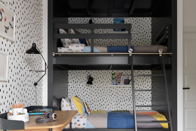 Поскольку детская комната в загородном доме служит одновременно спальной, гостиной и игровой зоной для маленького хозяина, важно позаботиться о создании многофункционального интерьера. Удачным решением станет зонирование помещения. Данный прием помогает выделить свободное пространство в центральной части, обеспечить возможность активного времяпровождения, создать ощущение простора.