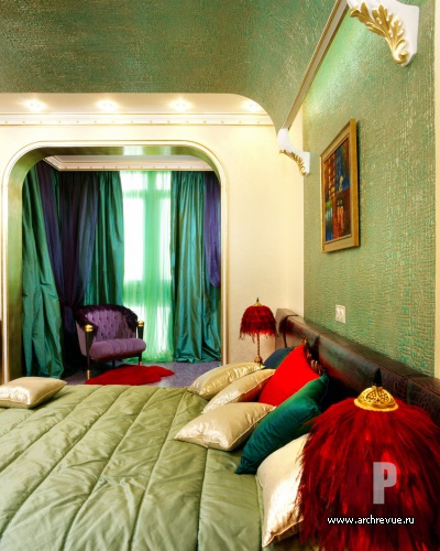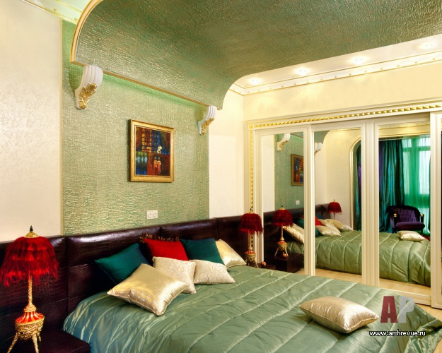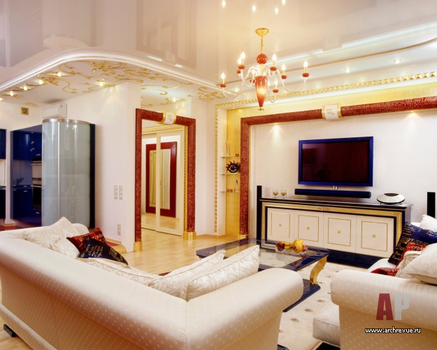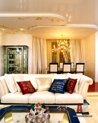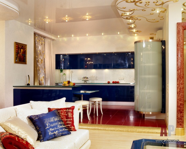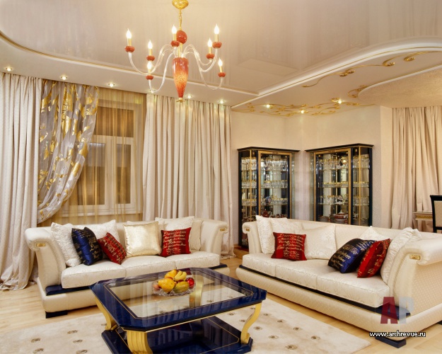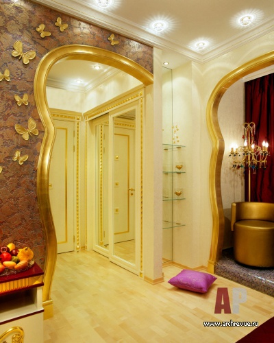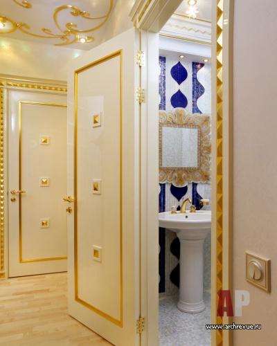 Интерьер это квартиры можно назвать рукодельным. Большая часть элементов оформления делалась по эскизам архитекторов и на заказ. Рельефные украшения потолков, фигурные ниши, обрамление дверей, сами двери, некоторые предметы мебели разработаны авторами, а реализованы российскими мастерами.