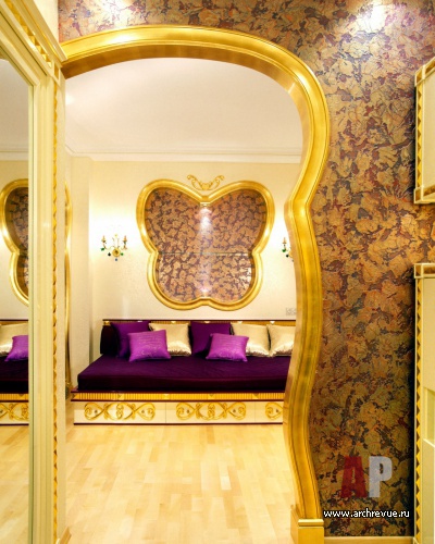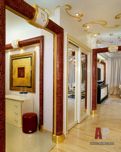 В этой квартире много золотого цвета. Он создает парадный настой. Однако золото – материал коварный, с ним легко переборщить, и тогда интерьер будет выглядеть нелепо. Поэтому очень важно рассчитать дозу золота. В нашем случае золоченые элементы появляются умеренно, где-то создают тонкую графическую линию, где-то почти сияние.