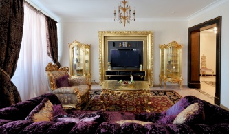 На полах – живописная рыжеватая массивная доска из ироко, в панелировании использована древесина тика, спальни украшены декоративными панно из эбенового дерева. Натуральное дерево сочетается с чёрным лаком и чёрным полированным гранитом. Черный и не только в отделке, но и в броских аксессуарах: в отделке рояля, мебели, текстиле. В зоне гостиной черный цвет поддержан фиолетовыми акцентами.