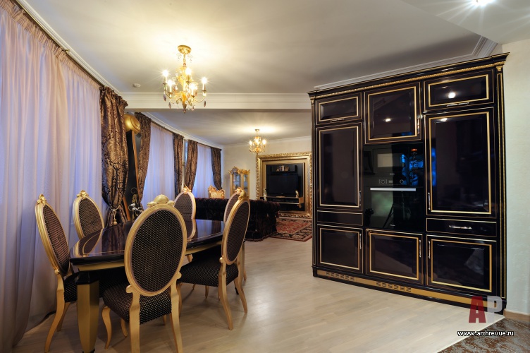Образ «ироничного барокко» воплощен с помощью индивидуальных художественных деталей и мебели в классическом барочном стиле. Например, все двери в квартире, встроенный шкаф в холле, декоративные колонны в гостиной выполнены на заказ, украшены резьбой и росписью.