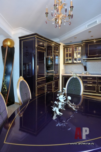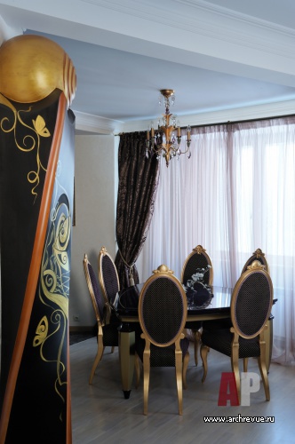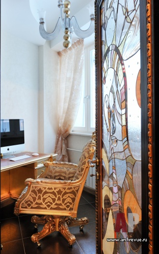 Сложный узор с позолотой на колоннах, отделяющих зону столовой от гостиной, повторен в изящном рисунке витражей, выполненных Екатериной Ивановой-Остапенко. Характерные особенности квартиры – яркая насыщенная цветовая гамма, обилие позолоты и образ райской птицы в золотой клетке.