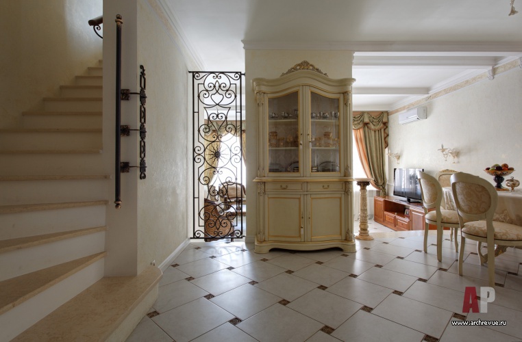 Интерьер таунхауса исполнен в средиземноморском стиле с элементами неоклассики. Дух Италии наиболее ощутим в гостевой зоне. В отделке зоны применены материалы в светло-бежевой цветовой гамме.