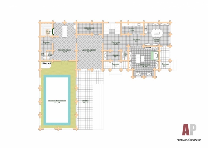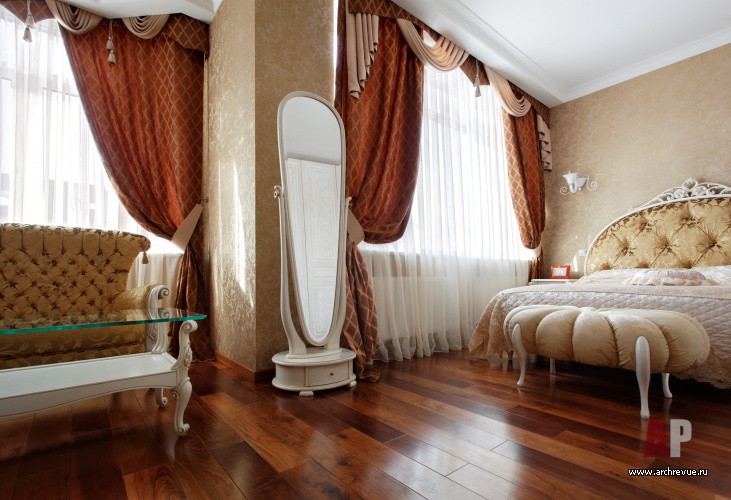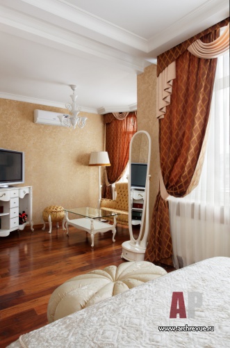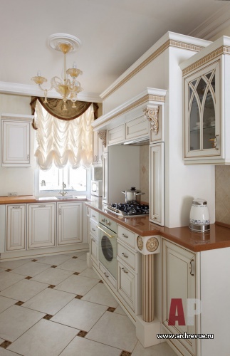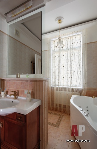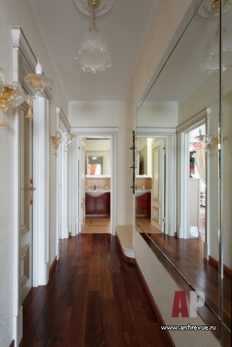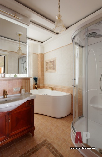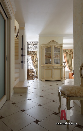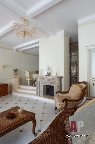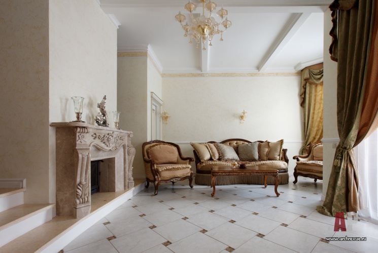 На полах – керамическая плитка, имитирующая натуральный камень, с декоративными рельефными вставками. На стенах – многослойная декоративная штукатурка с золотистым подтоном. Портал камина из резного камня, мебель классических форм, светильники с хрусталем довершают образ неоклассического интерьера.