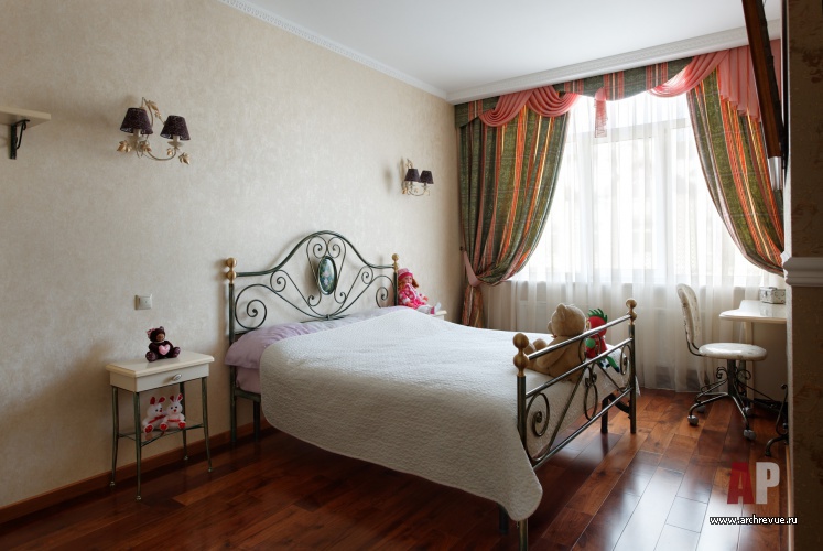 Второй этаж исполнен в более ярких цветах. Сочности интерьеру спален добавляют полы из древесины бразильского ореха. Пестрая рыжеватая доска и подобранный в тон ей текстиль контрастируют со светло-бежевыми отделками стен и фасадов мебели.