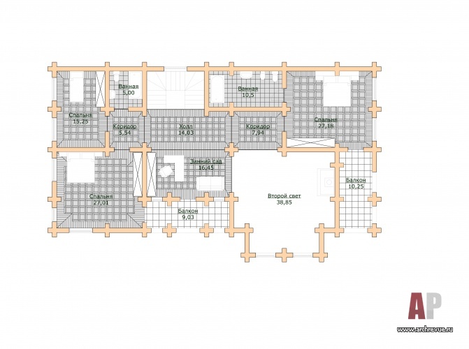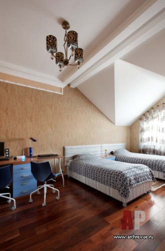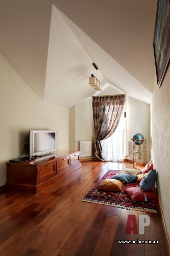 Второй и третий этажи предназначены для спален, санузлов и зоны отдыха. Особенность архитектуры верхнего этажа – сложная скошенная кровля, она вносит в интерьеры динамику.