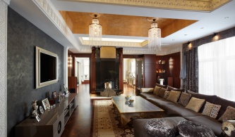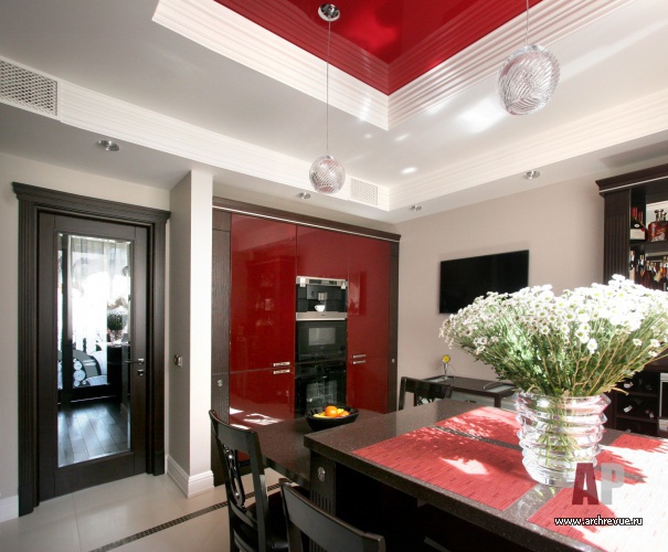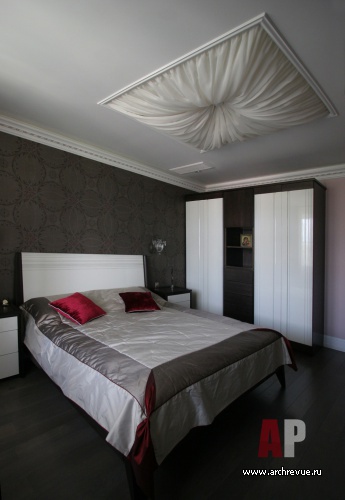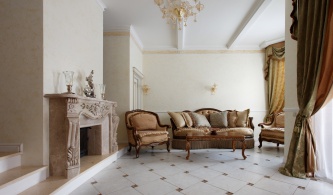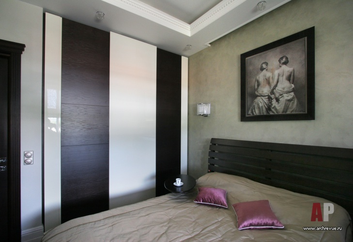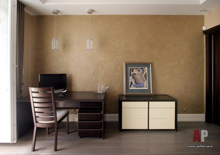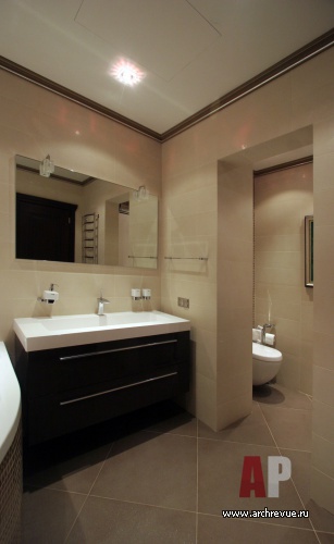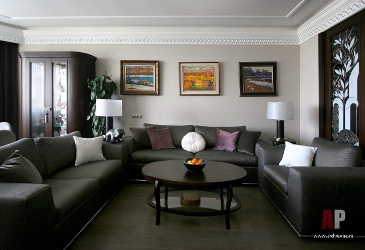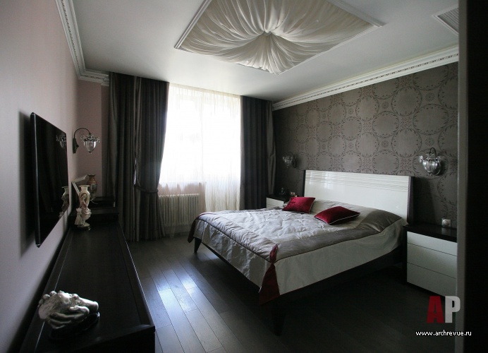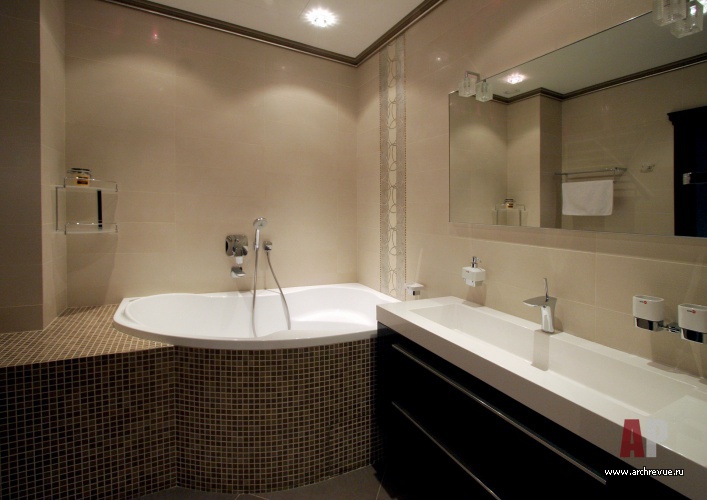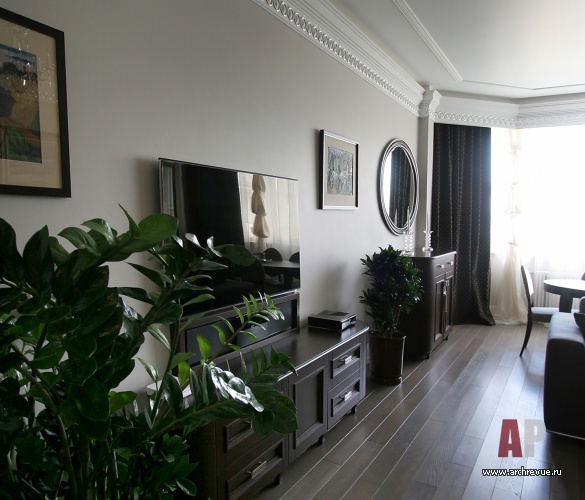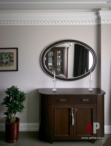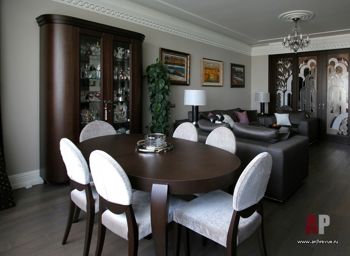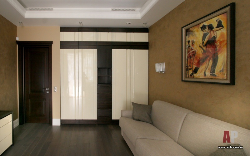 В оформлении квартиры в стиле фьюжн применялись современные натуральные материалы природных оттенков: светло-бежевого, коричневого, охристого, серого. Деревянные изделия (встроенная мебель, панели, двери) выполнены на заказ по эскизам архитектора российскими мастерами. Мотивы ар-деко прослеживаются в форме мебели и деликатном лепном декоре.