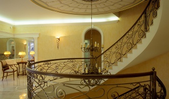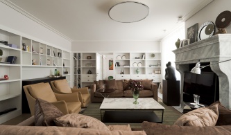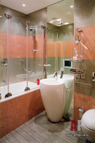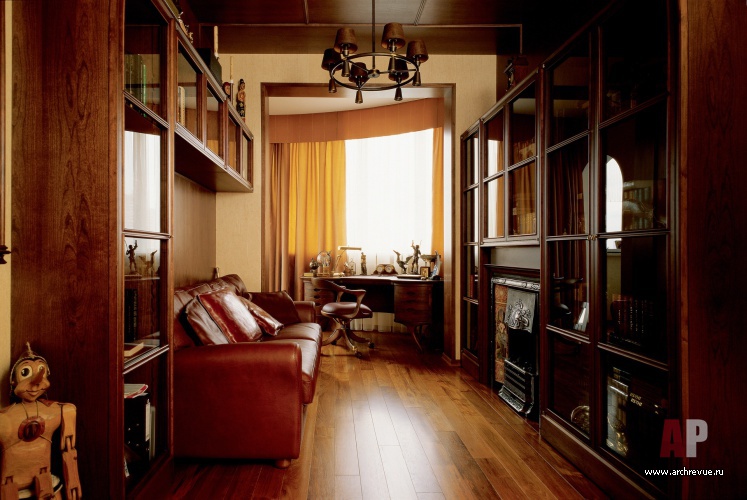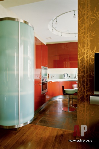 Интерьер гостиной и столовой «оживляют» обои с золотистыми стеблями бамбука. На кухне доминирует мебельный гарнитур из красного лака и цилиндрический холодильник из матового стекла. Кабинет хозяина дома, напротив, исполнен в классическом камерном стиле. Стеновые и потолочные панели, библиотека сделаны из шпонированного ореха. Спальня по желанию хозяйки выполнена в минималистичной восточной стилистике.