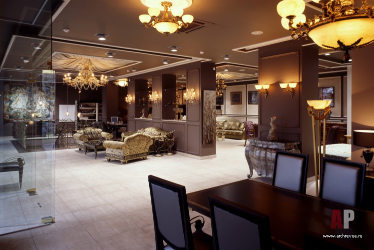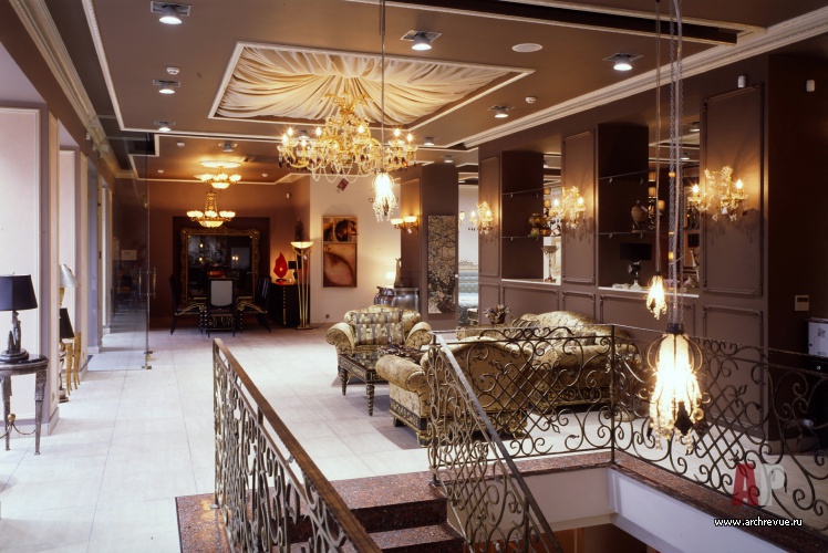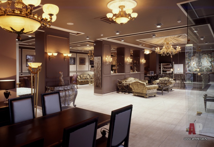 Помещение для мебельной экспозиции по форме приближается к квадрату и имеет высокие витрины, которые хорошо видны с улицы. Торговые залы занимают два уровня, они отличаются между собой не только ассортиментом (на первом этаже размещены коллекции люксовых марок, в подвальном – более демократичные бренды), но также планировкой и декором.