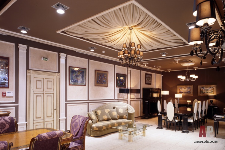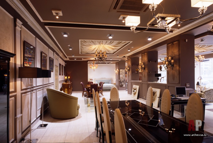 Архитекторам следовало создать грамотный антураж для экспозиции мебели компании «ТРИО-Интерьер» в классике и близкой к нему стилистике. Поэтому они решили пространство в неоклассическом ключе с традиционный деталями, создающими парадный настрой.