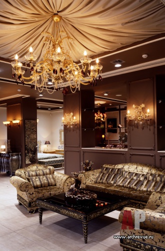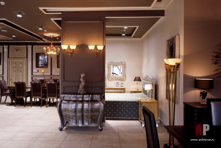Интерьер решен в помпезной классике. Конструктивные колонны оформлены как стеллажи и украшены традиционным лепным декором. Полы выстланы плиткой с имитацией светлого мрамора. Стены и потолки выкрашены в шоколадный оттенок.