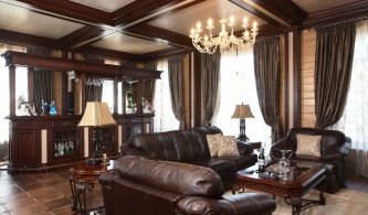 Бежевый и шоколадный – идеальный фон для предметов из дерева. Они не дает цветовых искажений на деревянную поверхность. Особое внимание уделено потолку. В одном месте он опущен, в другом – поднят, в третьем – украшен шелковым балдахином.