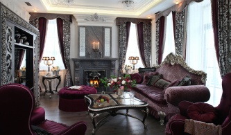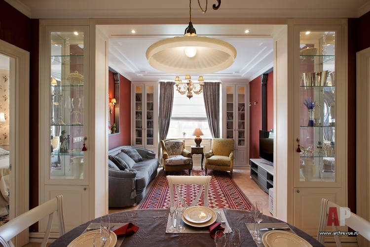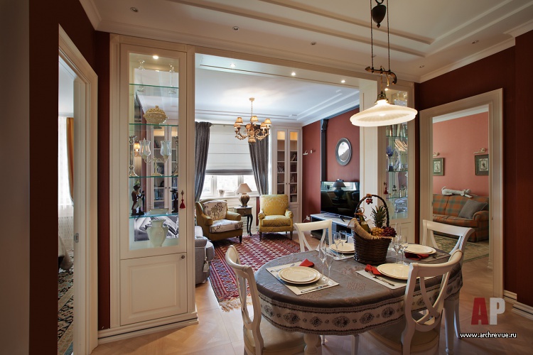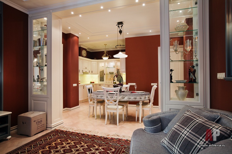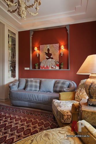 Особое значение в интерьере играет цвет. Стены выкрашены в насыщенные оттенки красного цвета (плотные цвета зрительно увеличивают объем помещений). С ними контрастирует столярные изделия (витрины, плинтуса, порталы дверей), выкрашенные в белый цвет. Уюта добавляет яркий текстиль и ковры.