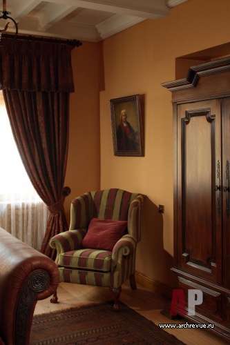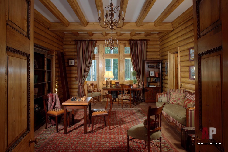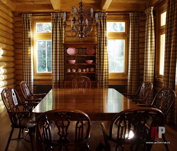Заказчики обратились к дизайнерам с предложением создать буржуазный интерьер в стиле старой Англии. Главное условие состояло в том, что сам дом должен был быть непременно деревянным, из оцилиндрованного бревна. Дерево – живой материал, он создает уют и полезен для здоровья.