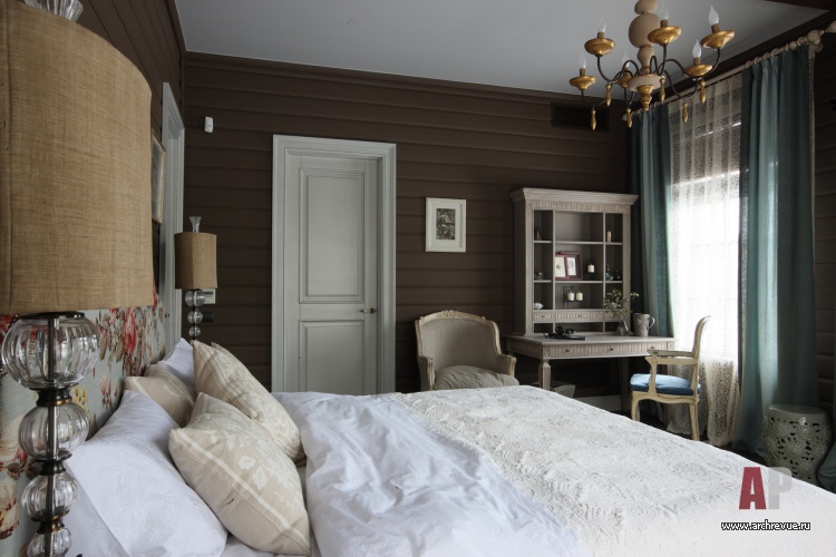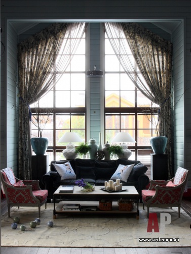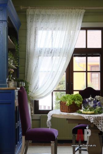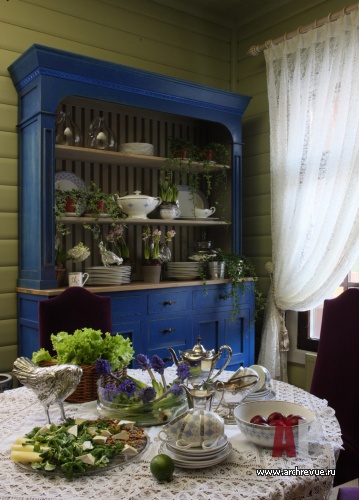 Интерьер дома строится на смелом и чрезвычайно красивом сочетании воздушного оттенка аквамирина и ягодно-цветочных оттенков розово-красного цвета. Мебель ручной работы со сложными финишами и росписью, старинные кружева и антикварные светильники создают ощущение интерьера с историей.