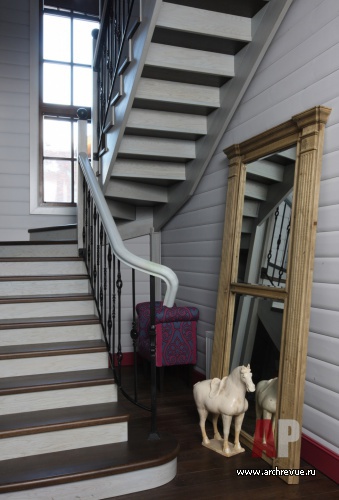 Компактная лестница расположена в прихожей, она ведет на этаж приватных помещений. Здесь находятся спальня, гостевая и детская.