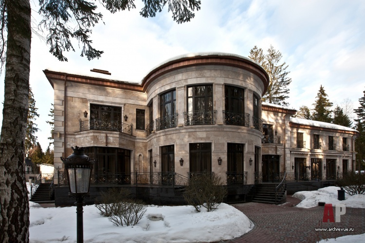 Трехуровневый особняк с высоким цоколем и полукруглым эркером изначально имел одноэтажное боковое крыло, где разместился SPA-комплекс (бассейн, сауна, хаммам).В процессе строительства заказчики предложили расширить приватную зону второго этажа за счет надстройки дополнительного объема над бассейном. В итоге крыша бассейна была превращена в полноценный жилой этаж.