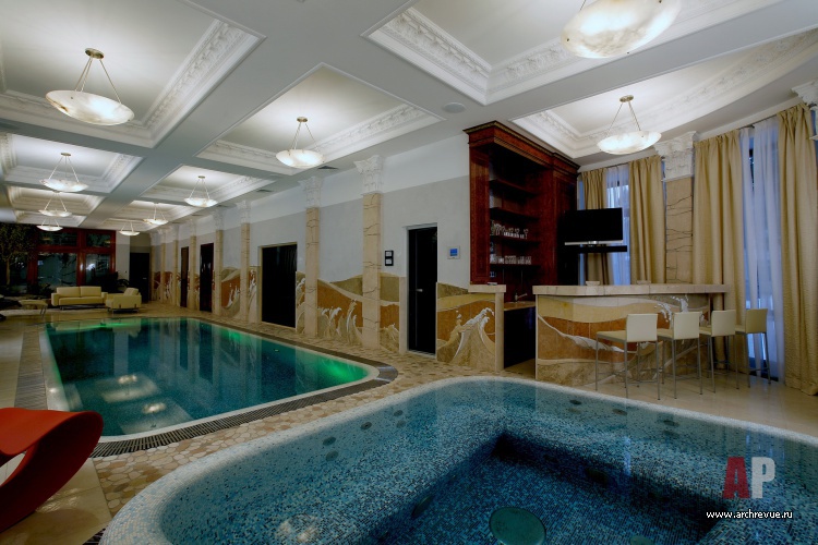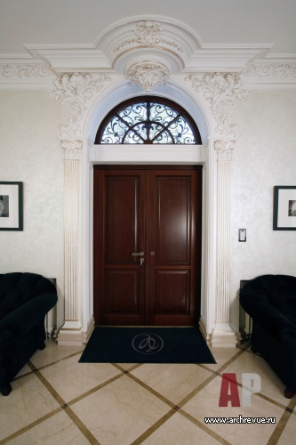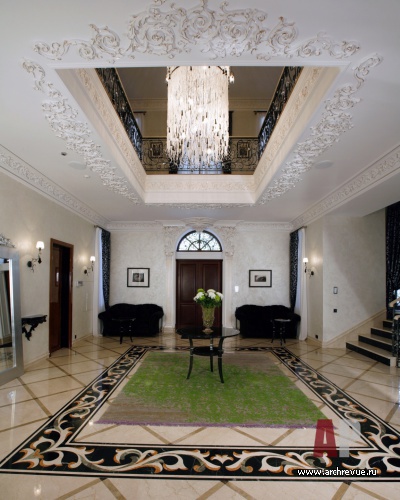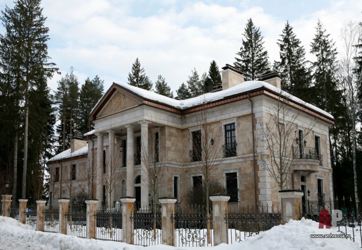 Загородное поместье располагается в живописном районе Подмосковья и занимает площадь 1,5 гектара. Помимо основного дома – каменного особняка в неоклассическом стиле с портиком и колоннами – на территории есть отдельный павильон с банкетным залом (более подробно о принципах и особенностях работы над проектом - см. здесь), флигель с гаражом и жильем для персонала, часовня. Одним из последних на участке был построен грандиозный SPA-комплекс с бильярдной (о дизайне его интерьеров – см. здесь).