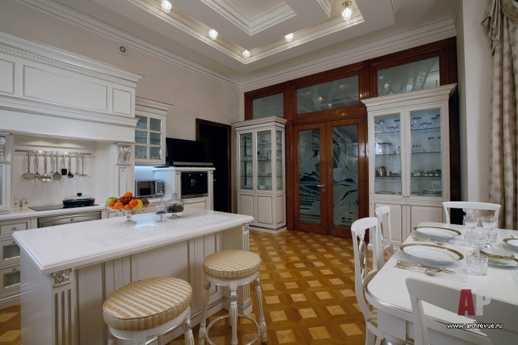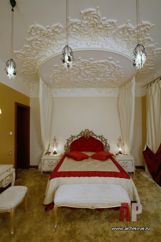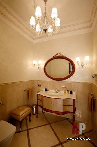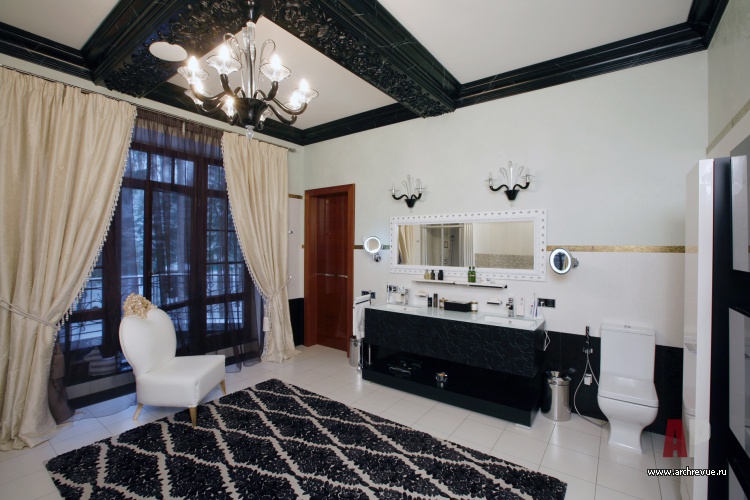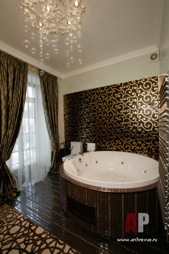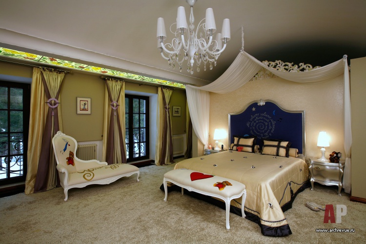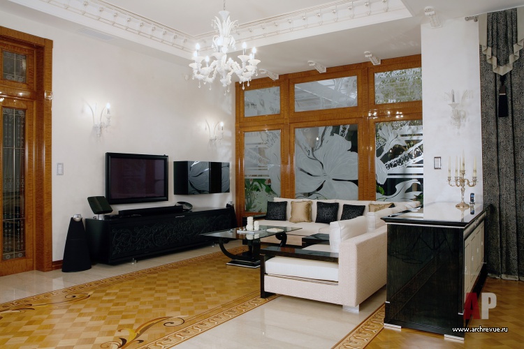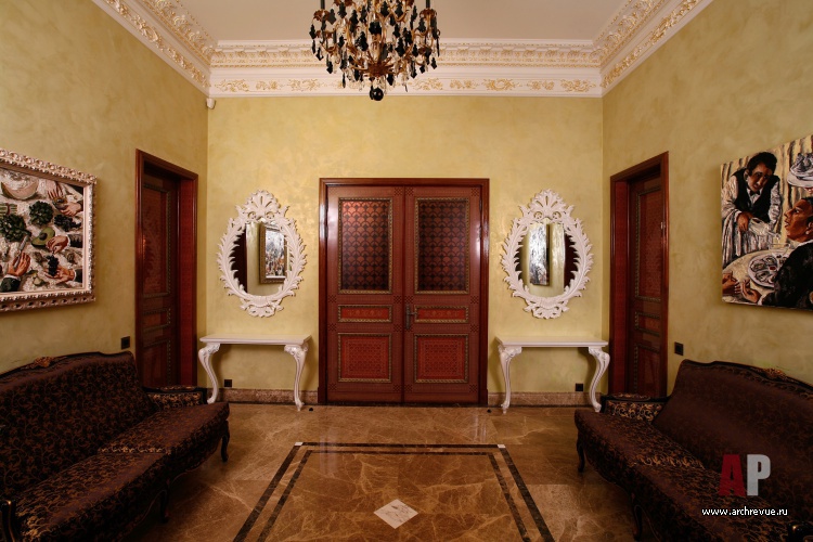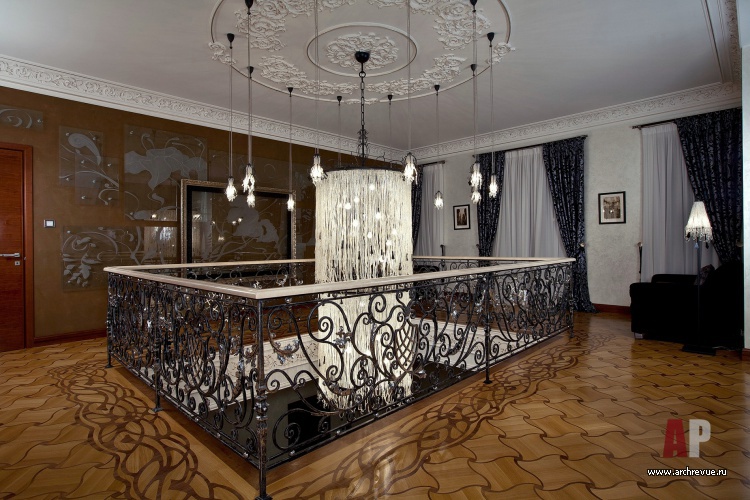 Интерьеры дома стилистически многогранны и визуально насыщенны. Согласно пожеланиям хозяев, каждый этаж исполнен в своей стилистике. Если на первом, парадном этаже преобладает традиционная классика с элементами ар-деко, то в спальнях можно увидеть цитаты из барокко, рококо, модерна и даже современной стилистики.