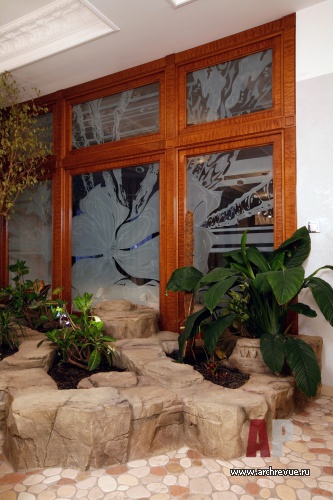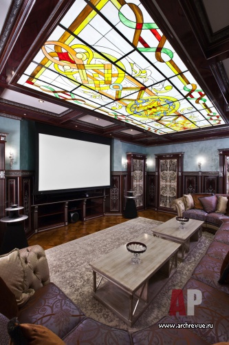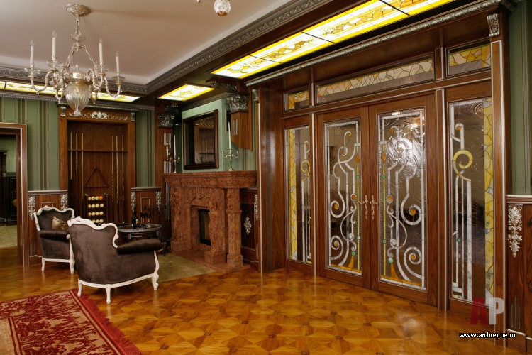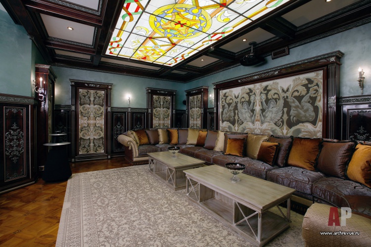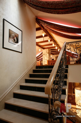 Цокольный этаж исполнен в английском стиле с деревянным панелированием и витражным стеклом. Мансарда – это уголок Востока со всеми характерными ориентальными приметами: резным деревом, шатровыми портьерами, каменным декором.