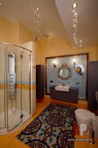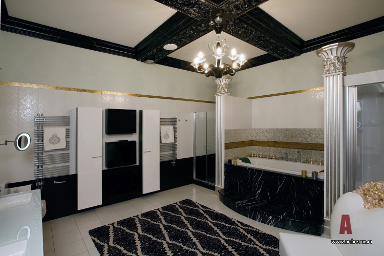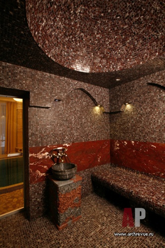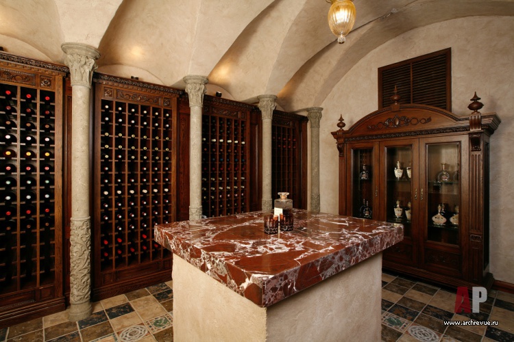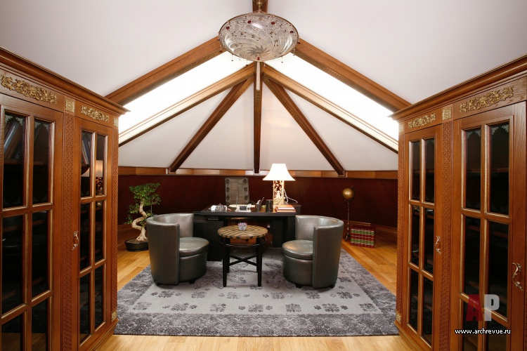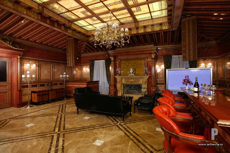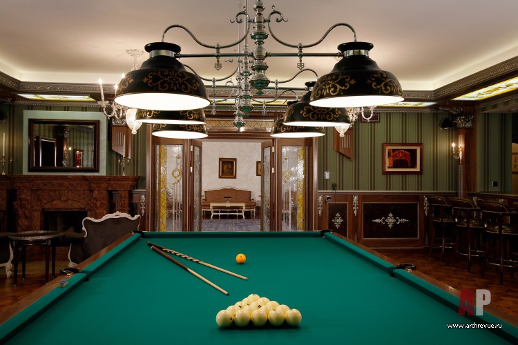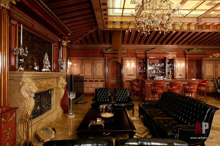 В мансарде расположена восточная зона отдыха, кабинет и библиотека. В цокольном этаже – «мужской клуб» с бильярдной, винным погребом и каминным залом.