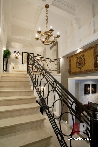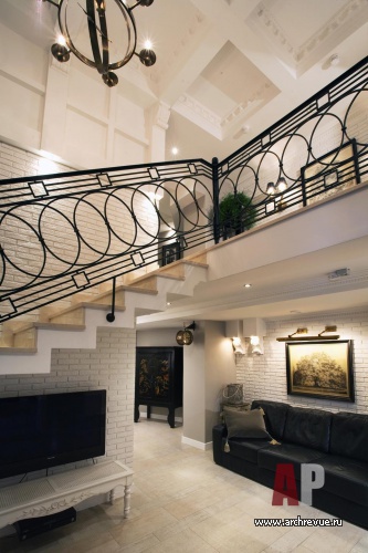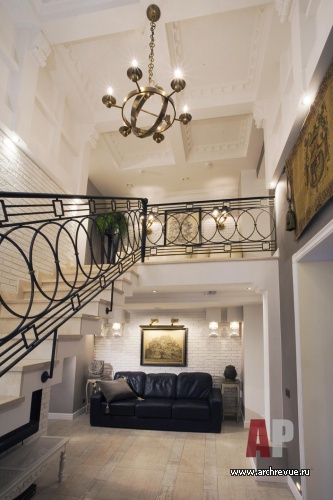 Самое просторное из них – двухсветный холл с лестничным маршем, оформленным выразительной ковкой. Из-за сложной конфигурации пространства часть помещений получила трапециевидную форму. Ассиметричные комнаты авторы проекта «сгладили» грамотной расстановкой мебели и точечными аксессуарами.