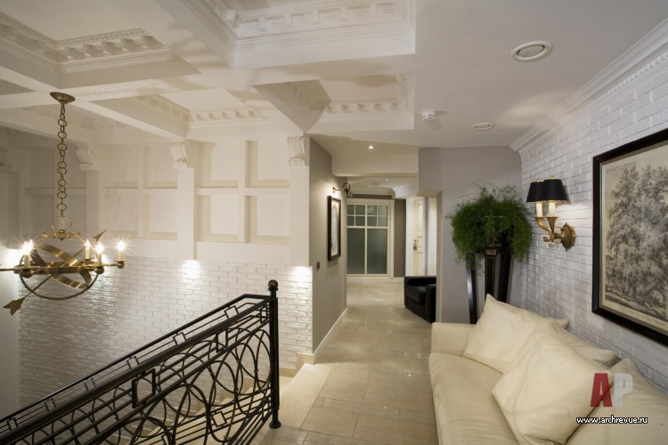С точки зрения психологии белые и серые оттенки помогают успокоиться и настроиться на позитив. Поэтому полы облицованы керамогранитом сложного бежево-серого оттенка, стены декорированы декоративной плиткой, выкрашенной в белый цвет и имитирующей кирпич, а потолки решены в пастельных тонах и украшены монументальными кессонами (в холле) и тонким лепным узором (в кабинетах).