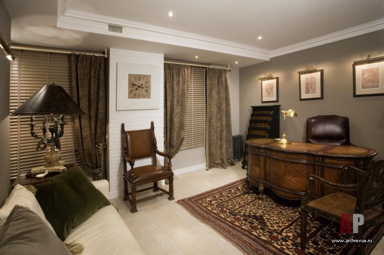 Предпочтение отдано добротной мебели кабинетного стиля. Патинированные комоды с раздутыми боками, столы, инкрустированные редкими породами дерева, кожаные диваны отсылают к оформлению классических домов конца XIX века.