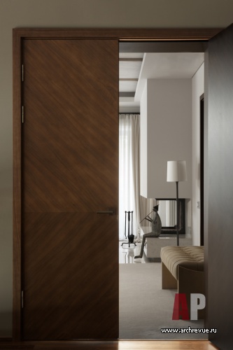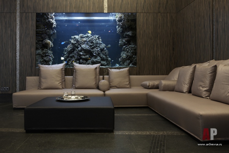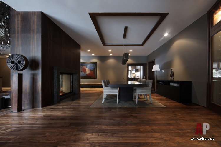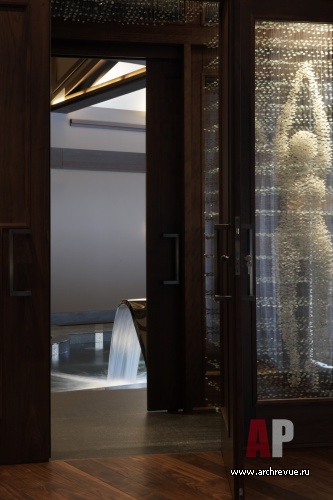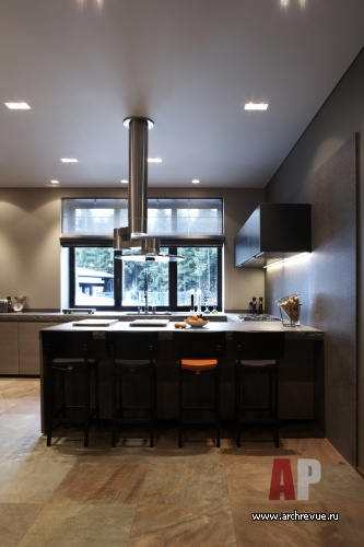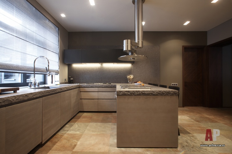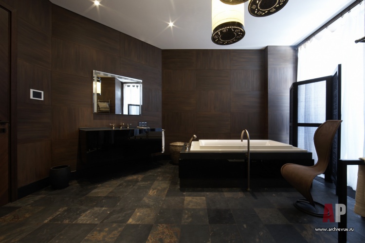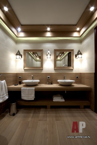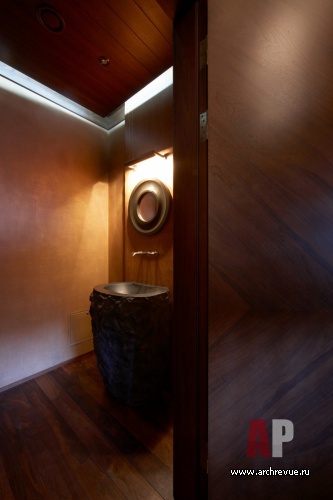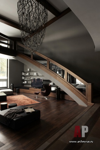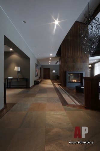 Образ интерьера строится на использовании натуральных материалов: экзотического африканского дерева, природного сланца, гранита, стекла, натуральных тканей. Определяющую роль в выборе материалов играла красота и тактильность фактур используемых материалов.
