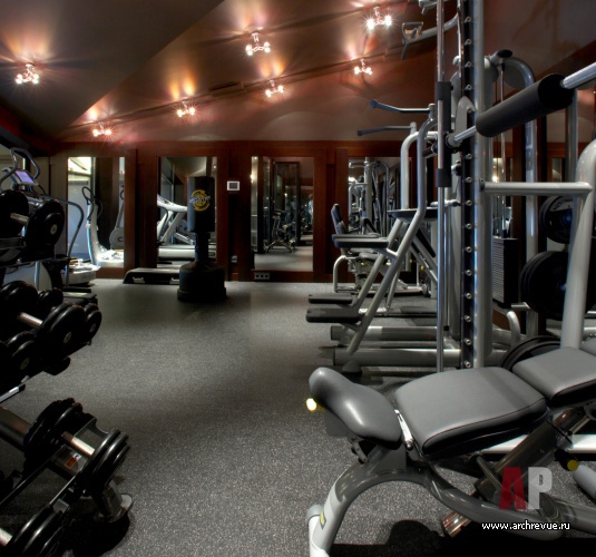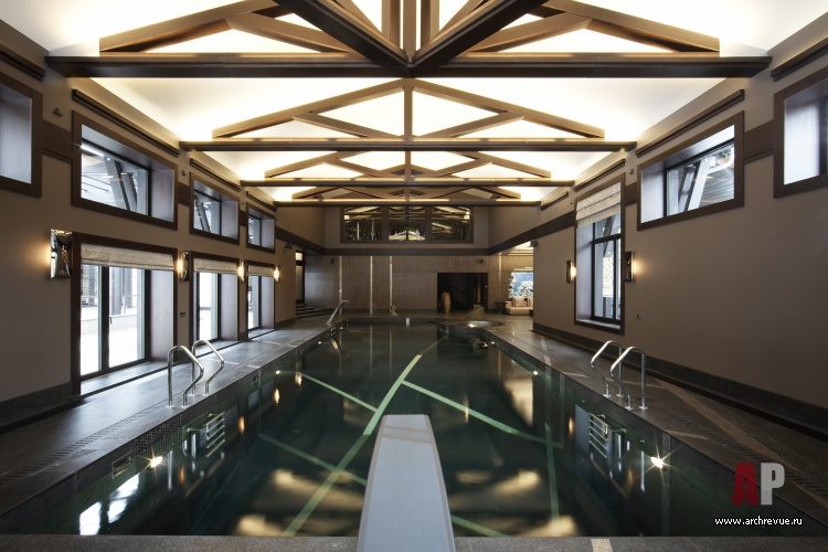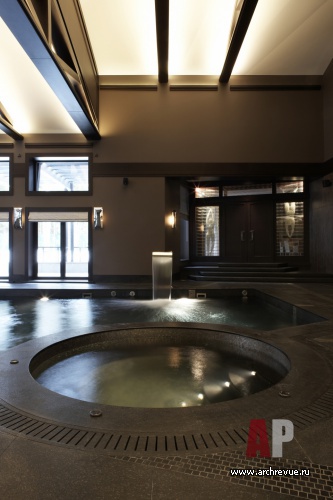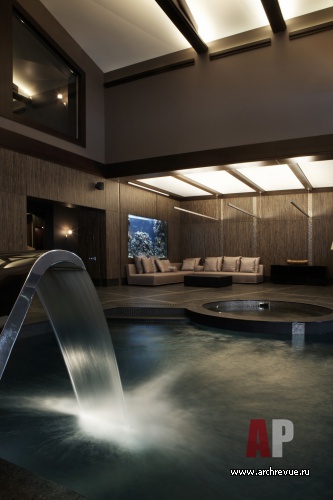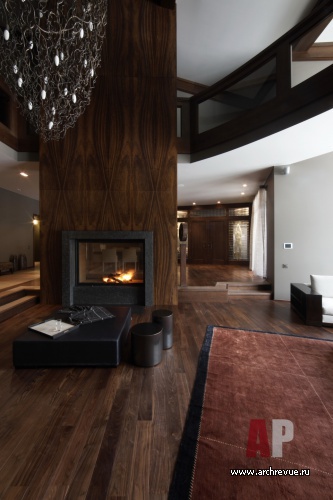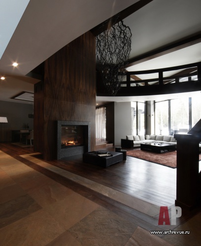 Первый уровень занимают общественные помещения. Решенные в едином двухсветном объеме гостиная, мягкая зона с ТВ, парадный лестничный холл и столовая визуально зонированы камином. К столовой примыкает SPA-комплекс с бассейном, зоной отдыха и сауной. Верхний уровень занимают приватные помещения.
