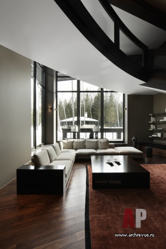 Динамку пространству придают дугообразные элементы, формирующие лестничный холл, балкон второго этажа и гостиную зону.