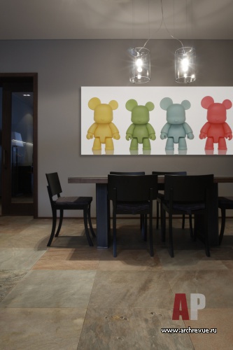 Созданию эффектной обстановки служат авторские изделия из дерева, дизайнерская мебель, авангардные металлические светильники и оригинальные объемные скульптуры из мозаики.