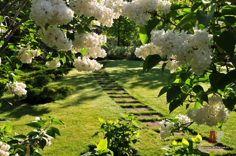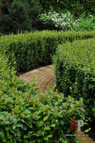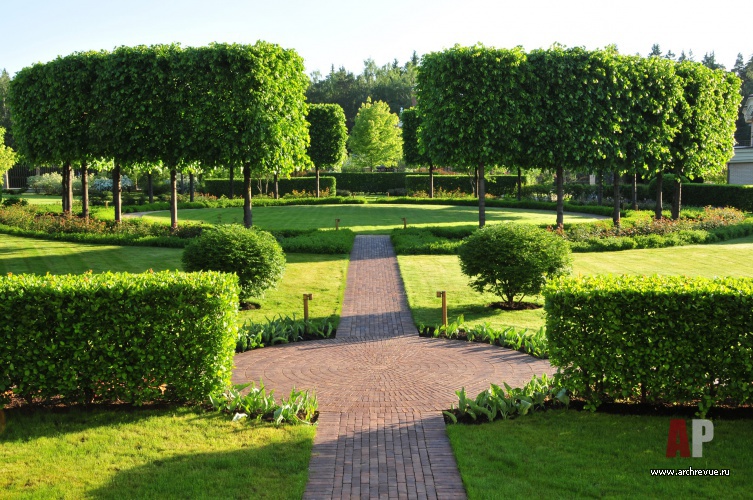 Идея планировки сада непосредственно связана с домом. Ось симметрии идет от крыльца дома, пересекая круг из лип. Площадка с бордюрами из стриженого кизильника блестящего (Cotoneaster lucidus) является смысловым продолжением террасы. Примыкающие к площадке, мощенной пиленным индийским песчаником, дорожки выложены прочным клинкером Hagemeister. Тропинки специально продуманы таким образом, чтобы по территории сада можно было гулять часами.