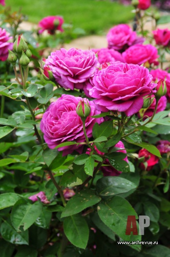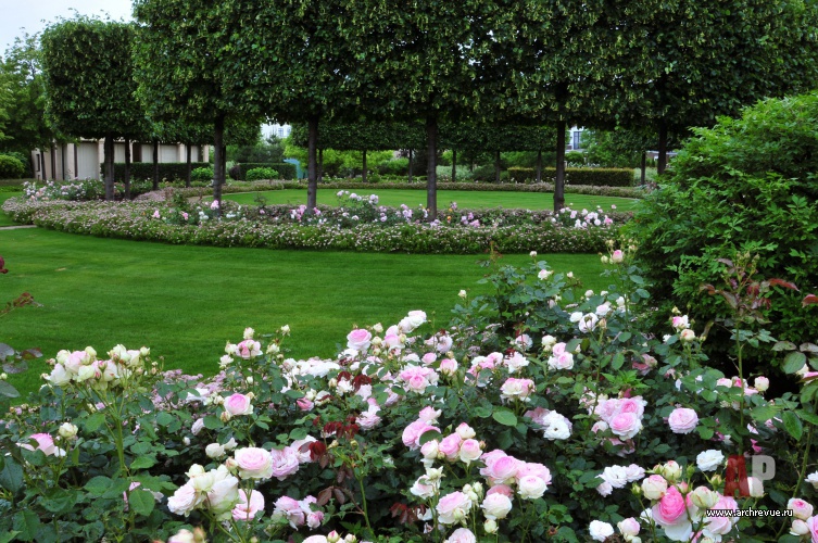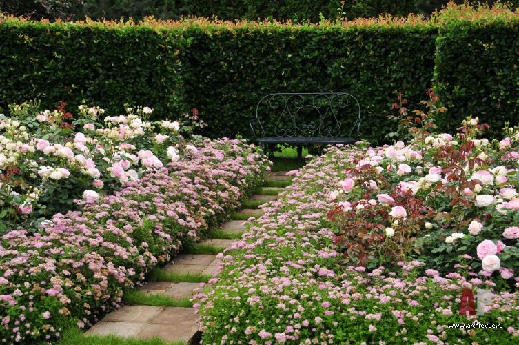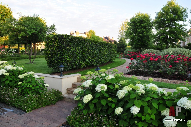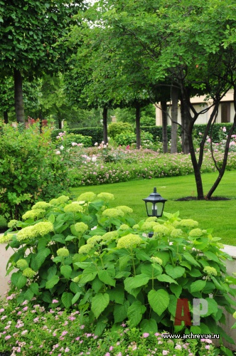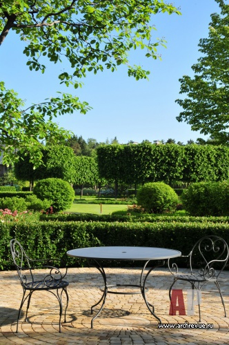 Композиционным центром и главной визуальной доминантой сада является расположенная перед главным домом лужайка идеально круглой формы. Вокруг нее по классическому французскому образцу высажены подстриженные в форме куба мелколистные липы (Tilia cordata). А под ними сооружен розарий, обрамленный спиреей японской (Little Princess). В период цветения, усыпанная множеством нежных соцветий, она выглядит особенно эффектно, а если ее постричь – превращается в аккуратный зеленый бордюр высотой около 30 см.